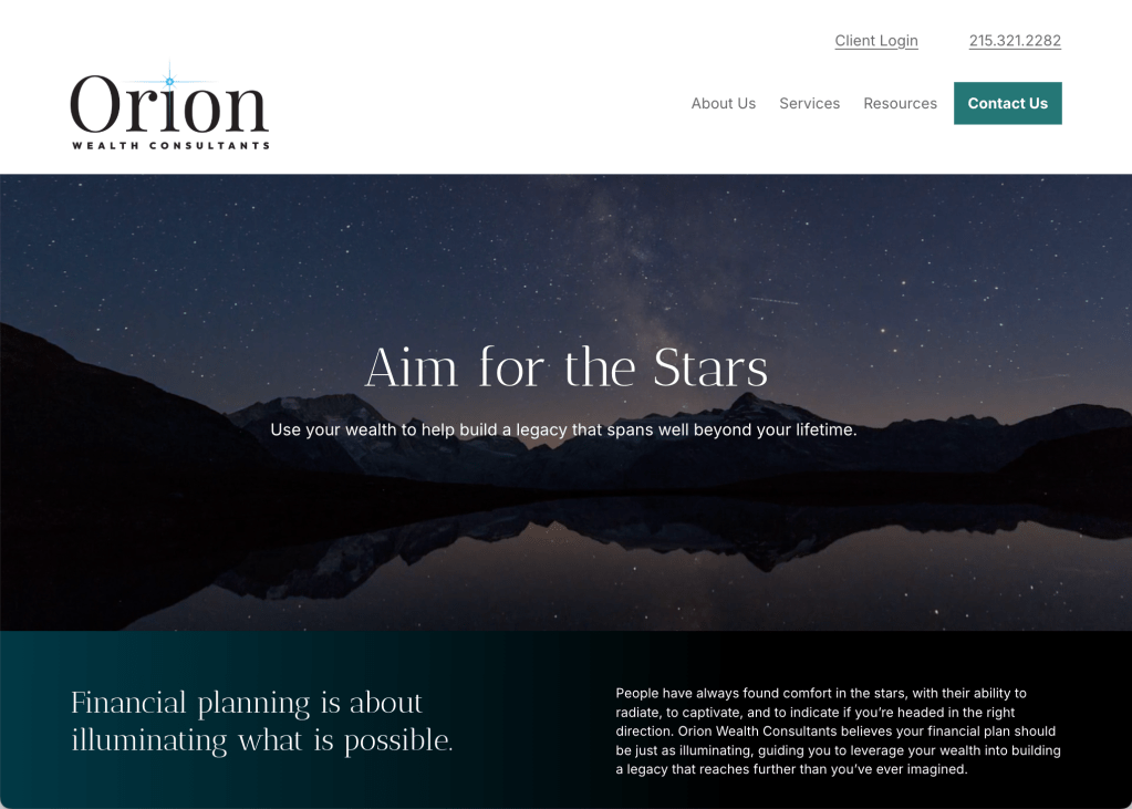Helping people of all ages is what drives Joe Sullivan as a financial planner and community volunteer. While on a camping trip with inner city kids, Joe saw their wonder and excitement at discovering the countless stars above. This experience illuminated his vision for Orion Wealth Consultants. He wanted a brand that inspired individuals and families to think bigger, bolder, and brighter about their financial future.