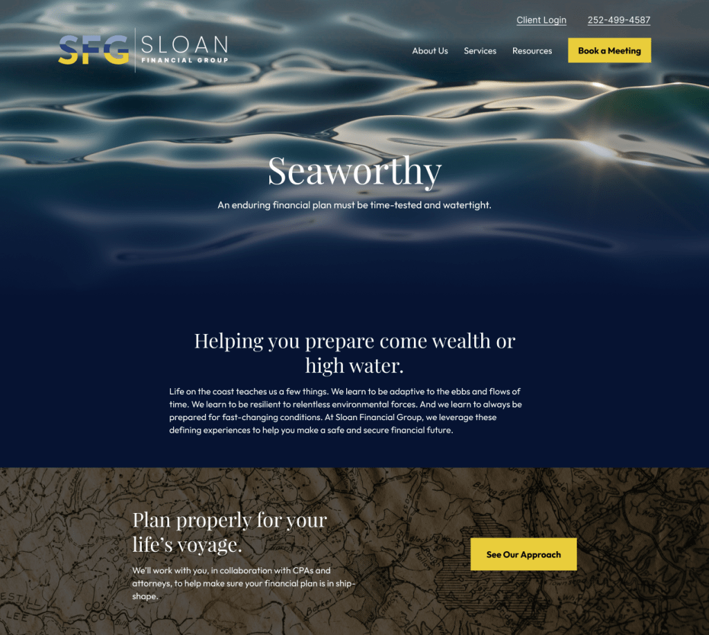 Kirby Sloan founded Sloan Financial Group to help high-net-worth and high-performing professionals simplify their financial lives, grow their wealth efficiently, and protect their legacies. He was previously affiliated with Edward Jones and had no brand identity of his own, so he wanted to create a truly unique brand that would resonate with his local waterfront community and rise above the competition.
